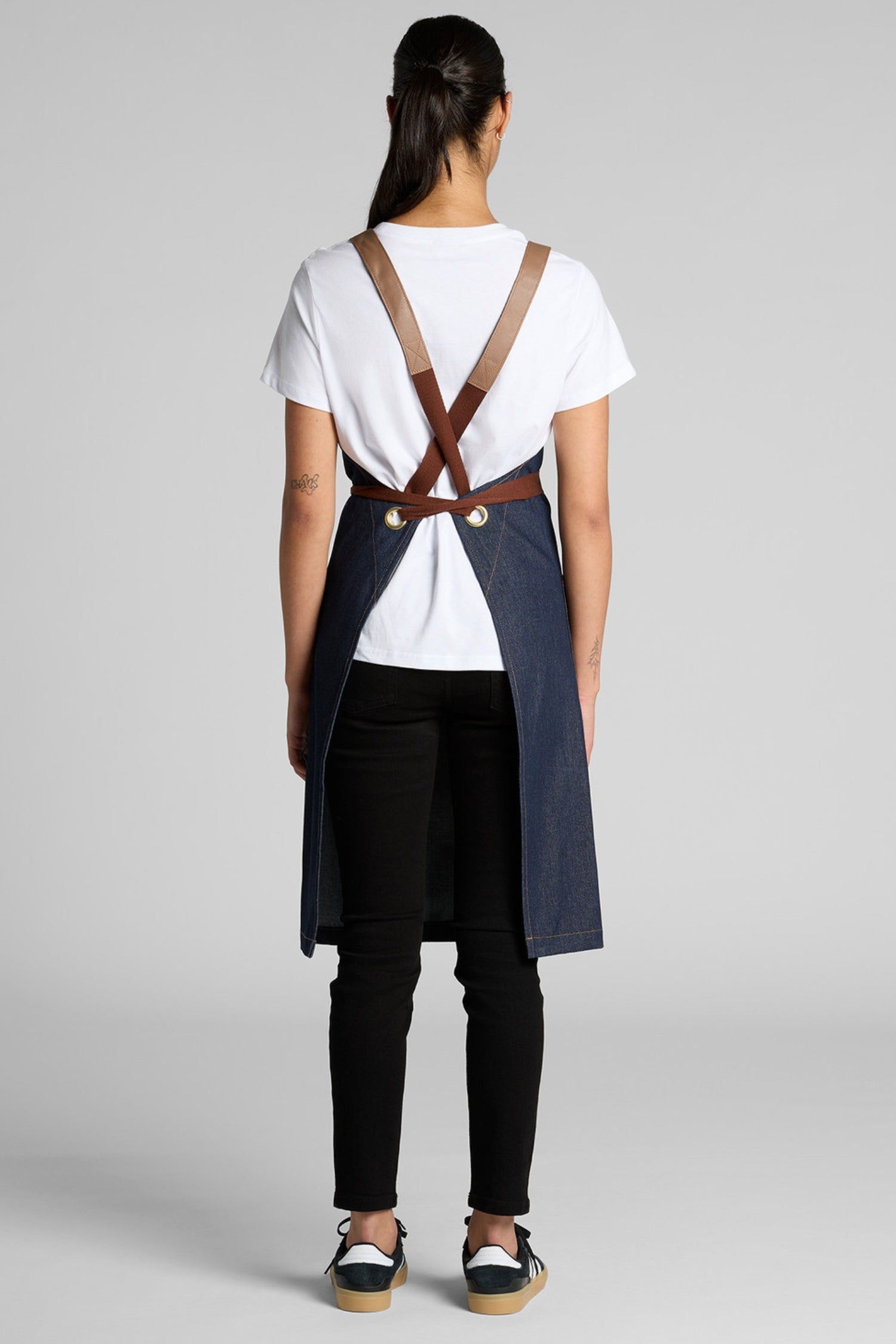 Le contraste entre la toile denim brute et les détails en cuir crée une esthétique raffinée et contemporaine. Le tablier conserve sa souplesse tout en protégeant efficacement contre la chaleur et les éclaboussures. Chaque surpiqûre, chaque œillet, chaque sangle a été pensé pour durer — un design professionnel au service du confort et du style.